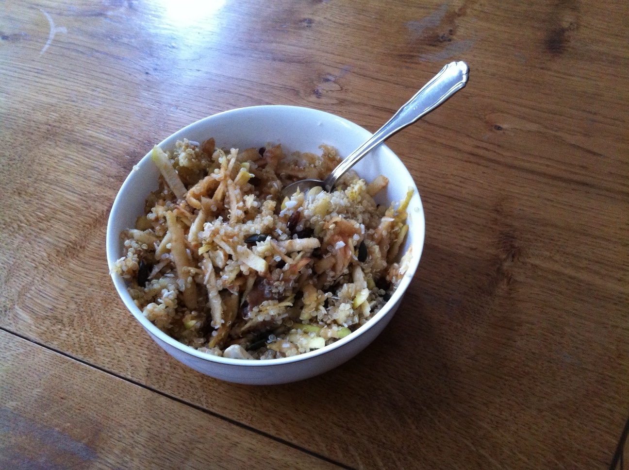 I tend to wait for a couple of minutes before eating, so that the quinoa and coconut can soak up some of the fresh apple juice.